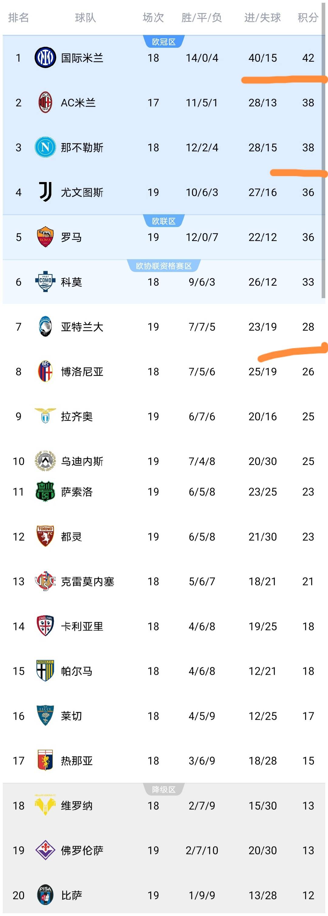 หลังจากชัยชนะ 2-0 เหนือปาร์มา อินเตอร์ มิลาน ขึ้นนำจ่าฝูงของเซเรีย อา ด้วยคะแนน 42 คะแนน ซึ่งไม่สามารถถูกแซงได้แม้ว่าเอซี มิลานจะชนะในรอบนี้ก็ตาม ในขณะเดียวกัน ความพ่ายแพ้ของนาโปลีทำให้พวกเขาไม่สามารถแซงหน้าเอซี มิลานได้ ซึ่งถือเป็นข่าวดีสำหรับรอสโซเนรีและยิ่งเป็นข่าวดีสำหรับเนรัซซูรีอตาลันต้าไต่ขึ้นสู่อันดับที่เจ็ดหลังจากเอาชนะโบโลญญ่า 2-0 ขณะที่ฟิออเรนติน่ายังคงอยู่อันดับรองสุดท้ายหลังจากเสมอกับลาซิโอ อย่างไรก็ตาม ฟิออเรนติน่าตอนนี้มีคะแนนเหนือโซนตกชั้นเพียงสองแต้มเท่านั้น ซึ่งช่วยเพิ่มโอกาสในการหนีตกชั้นได้อย่างมาก โบโลญญ่าอยู่อันดับที่แปด อูดิเนเซ่อยู่อันดับที่สิบ และปาร์ม่าอยู่อันดับที่สิบห้า
