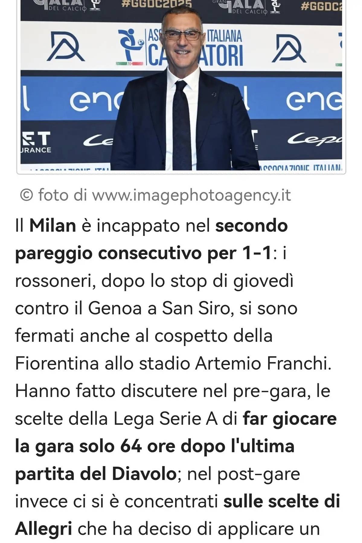 อดีตนักเตะและนักวิเคราะห์ของอินเตอร์ มิลาน, เบ็ปเป้ เบอร์โกมี, แสดงความคิดเห็นเกี่ยวกับผลงานของมิลานในฟลอเรนซ์ว่า: "ผู้จัดตารางการแข่งขันควรออกมาชี้แจง: ก่อนหน้านี้จัดให้มิลานเจอกับคาลยารีในวันศุกร์ แล้วบังคับให้พวกเขาต้องเล่นกับเจนัวในวันพฤหัสบดี"ในความเห็นของผม อัลเลกรีได้พิจารณาโปรแกรมทั้งสองนัดแล้ว และสรุปว่าการเจอกับโคโมจะยากกว่าการพบกับฟิออเรนติน่า นี่คือการคาดเดาเหตุผลของเขา อย่างไรก็ตาม มิลานมีโอกาสชัดเจนถึงสามครั้งที่จะทำประตูได้ในครึ่งแรก...