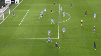 ในช่วงทดเวลาบาดเจ็บของครึ่งแรก ครอสของแรชฟอร์ดถูกเบี่ยงเบน ทำให้ยามาลสามารถยิงเข้าประตูอย่างใจเย็นที่เสาไกล ส่งผลให้บาร์เซโลนาขึ้นนำอีกครั้ง