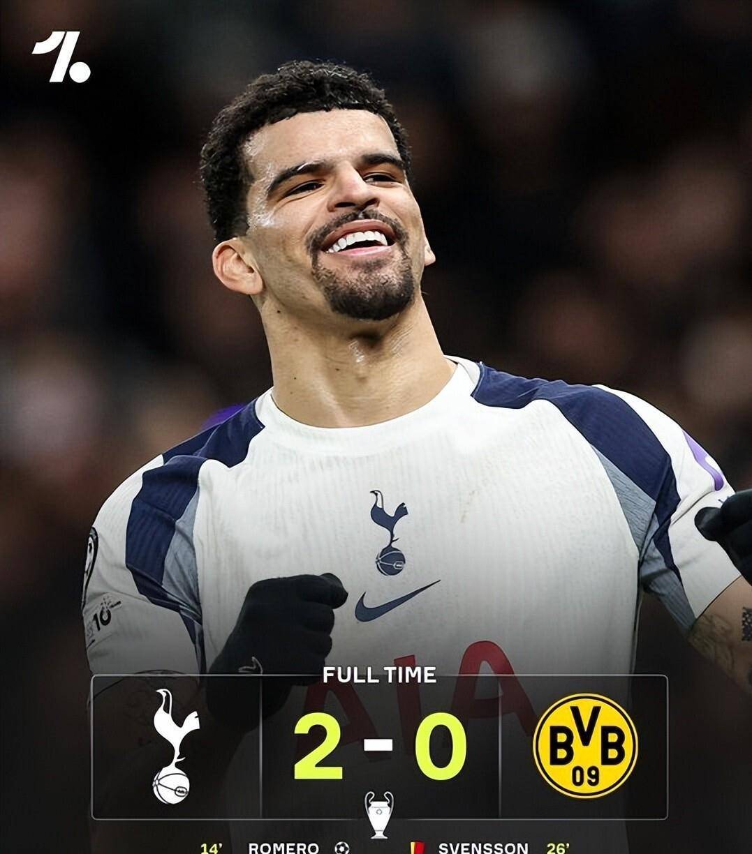 ท็อตแน่ม ฮ็อตสเปอร์ส สโมสรจากลอนดอนเหนืออีกทีมหนึ่ง ใช้โอกาสของพวกเขาได้อย่างเต็มที่ โรมิโร่ทำประตูด้วยการโหม่งในนาทีที่ 14 ต่อโบรุสเซีย ดอร์ทมุนด์ ทำให้ทีมเจ้าบ้านควบคุมเกมได้อย่างมั่นคง สถานการณ์ของทีมเยือนย่ำแย่ลงเมื่อสเวนส์สันของดอร์ทมุนด์ถูกใบแดงไล่ออกจากสนามในนาทีที่ 26 โซลันเก้ทำประตูที่สองให้ทีมนำห่างเป็น 2-0 ในนาทีที่ 37 สกอร์นี้คงอยู่จนถึงสิ้นเสียงนกหวีดสุดท้าย ทำให้สเปอร์สคว้าชัยชนะที่คุ้มค่าและแซงดอร์ทมุนด์ขึ้นไปอยู่ในอันดับที่ดีกว่าในตารางคะแนน