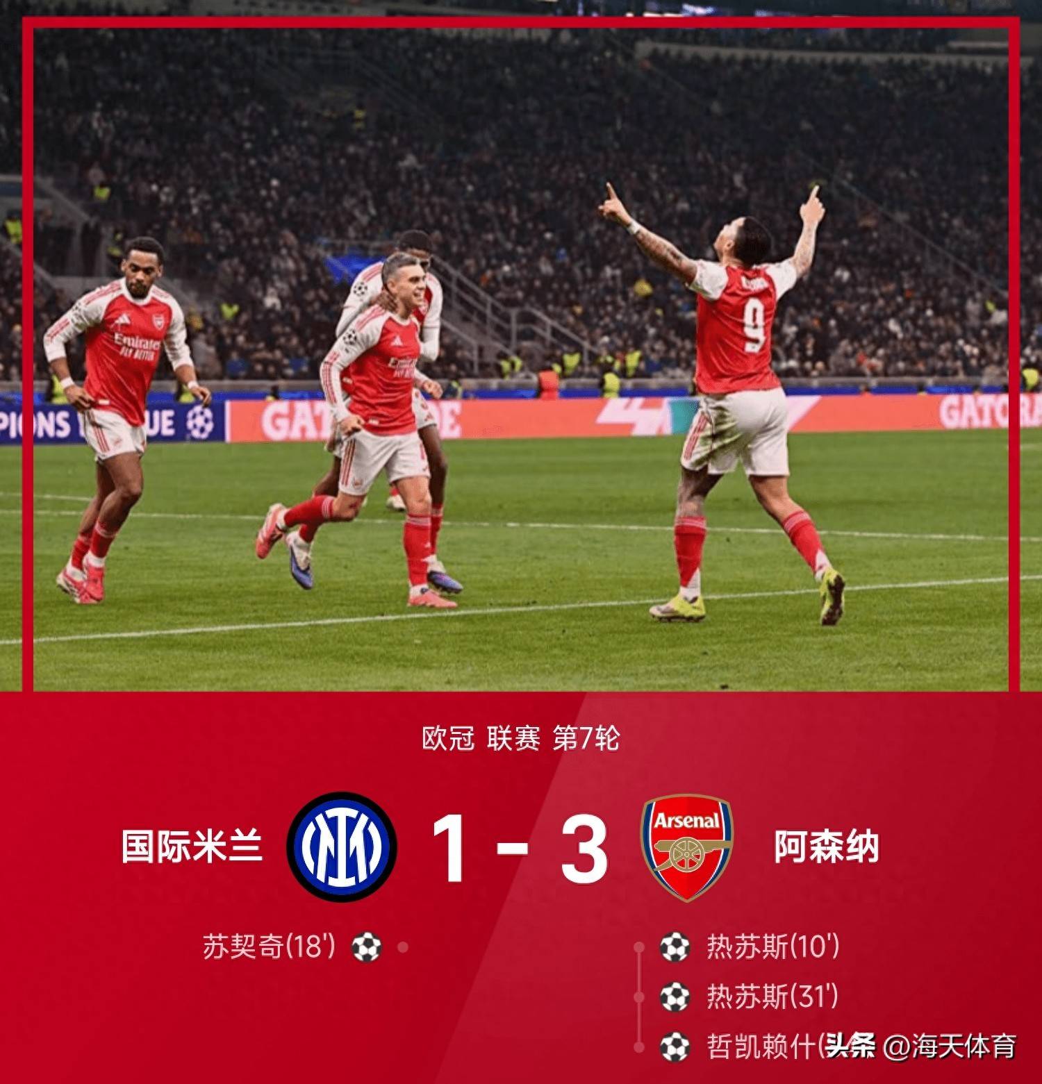 เมื่อวันที่ 21 มกราคม ในแมตช์เดย์ที่ 7 ของรอบแบ่งกลุ่มยูฟ่าแชมเปียนส์ลีก ฤดูกาล 2025/26 อินเตอร์ มิลาน เปิดบ้านต้อนรับการมาเยือนของอาร์เซนอล ในครึ่งแรก กาเบรียล เชซุส เปิดสกอร์ด้วยการยิงวอลเลย์จ่อๆ จากระยะใกล้ จากนั้น อีวาน ซูชิช ตีเสมอด้วยลูกยิงสุดสวยจากระยะไกล เชซุส ตอบโต้ทันทีด้วยการโหม่งกลับขึ้นนำให้อินเตอร์อีกครั้ง หลังจากพักครึ่ง เซกี เชลิค ลงมาจากม้านั่งสำรองและยิงไกลทำประตูได้สำเร็จเต็มเวลา: อาร์เซนอล 3-1 อินเตอร์ มิลาน. ปืนใหญ่รักษาสถิติไร้พ่ายไว้ได้ และผ่านเข้ารอบ 16 ทีมสุดท้ายของยูฟ่า แชมเปียนส์ลีกแล้ว.