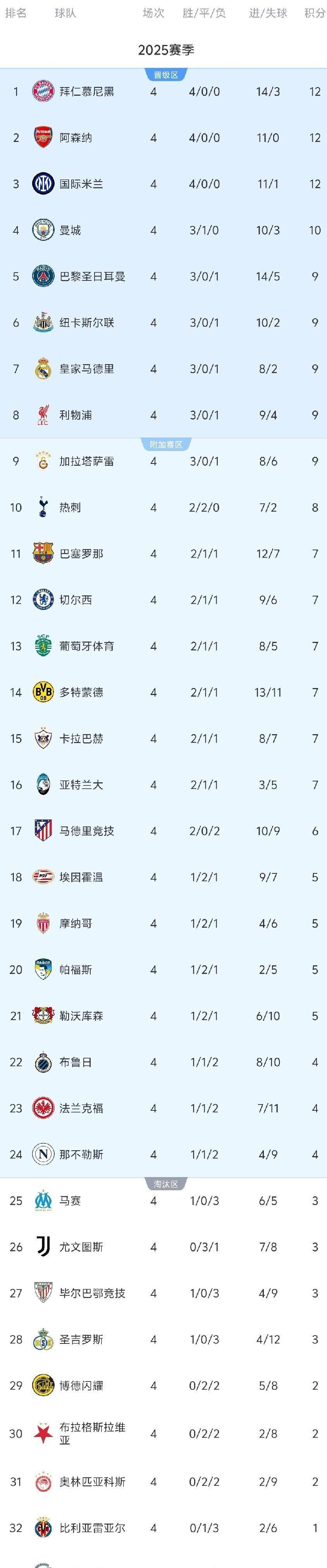 หลังจากผ่านไปสี่รอบของการแข่งขัน ตารางคะแนนแชมเปียนส์ลีกแสดงให้เห็นถึงการแบ่งกลุ่มที่ชัดเจน บาเยิร์น มิวนิค, อาร์เซนอล และอินเตอร์ มิลาน นำเป็นจ่าฝูงด้วยคะแนน 12 คะแนนเท่ากัน บาเยิร์นครองอันดับหนึ่งด้วยผลต่างประตูได้เสีย โดยทำได้ 14 ประตูและเสียเพียง 11 ประตู อาร์เซนอลมีสถิติการป้องกันที่สมบูรณ์แบบ โดยเก็บคลีนชีตได้ 4 นัดจาก 4 นัดแรก อินเตอร์ มิลานมีประสิทธิภาพอย่างน่าทึ่ง โดยทำได้ 11 ประตูและเสียเพียง 1 ประตูเท่านั้น แมนเชสเตอร์ ซิตี้ ตามมาติด ๆ ด้วย 10 คะแนน ขณะที่ ปารีส แซงต์-แชร์กแมง, นิวคาสเซิล ยูไนเต็ด, เรอัล มาดริด และ ลิเวอร์พูล อยู่ในกลุ่มที่สอง โดยมี 9 คะแนนเท่ากัน