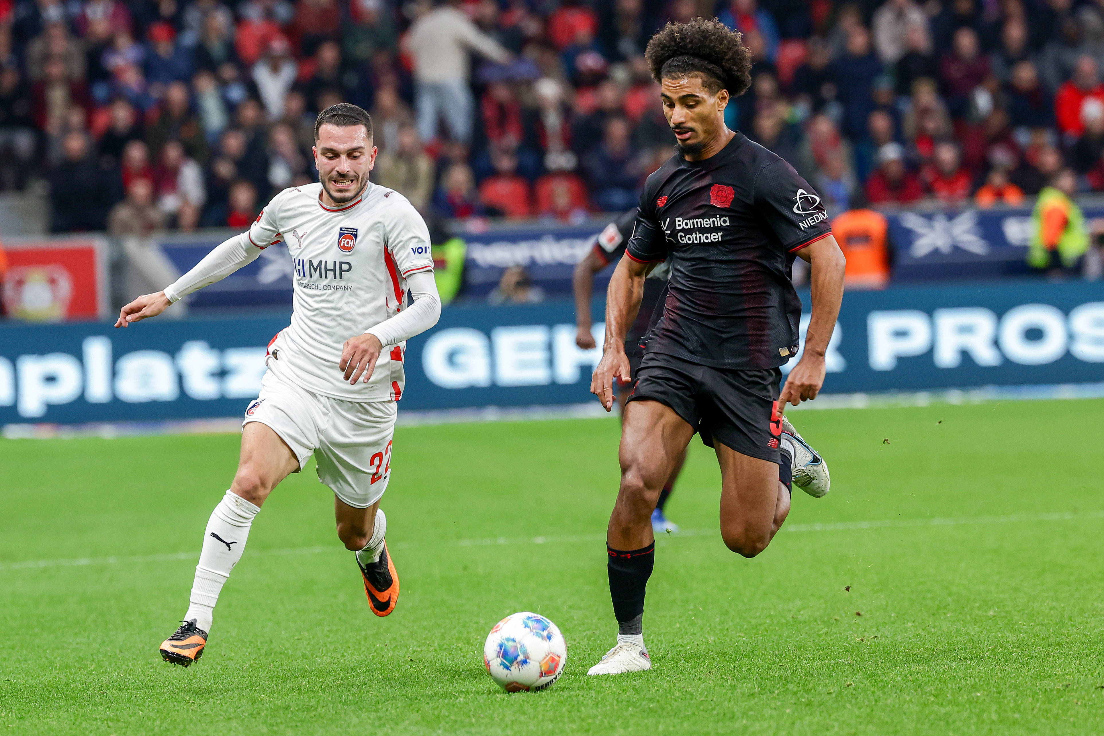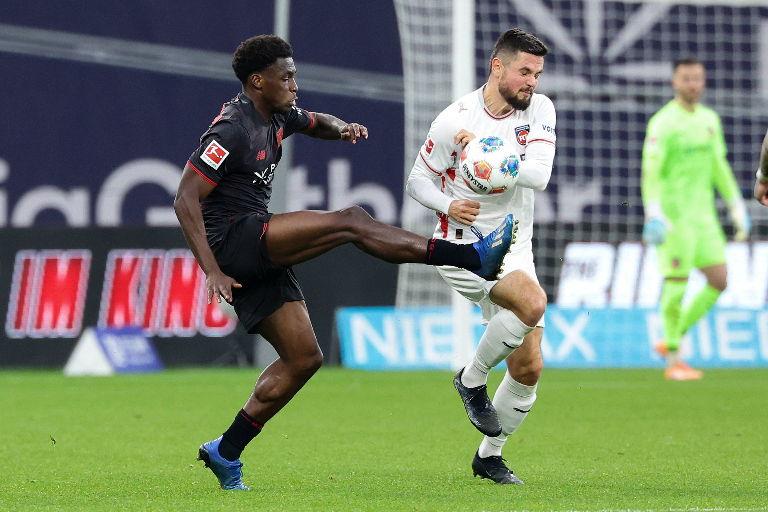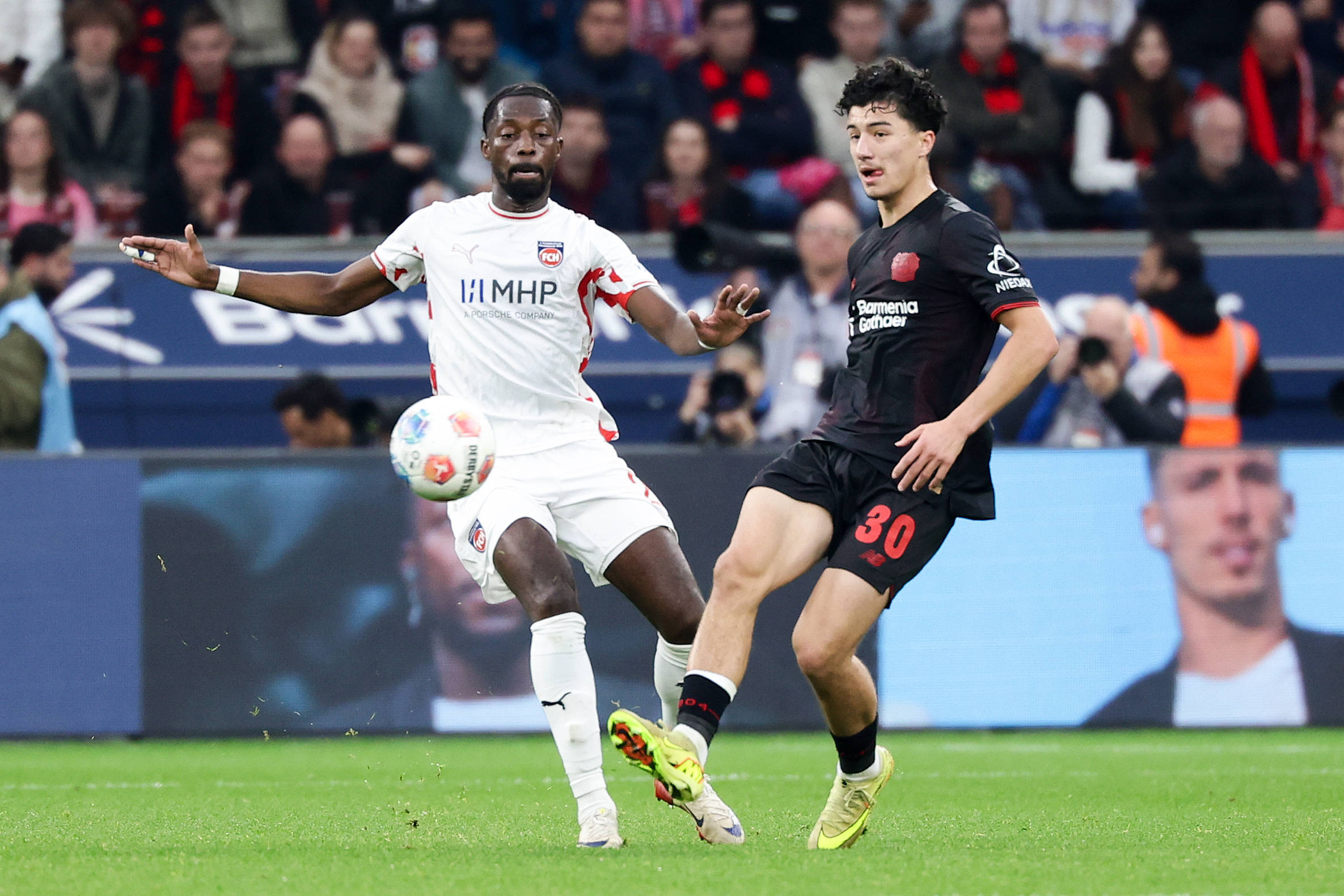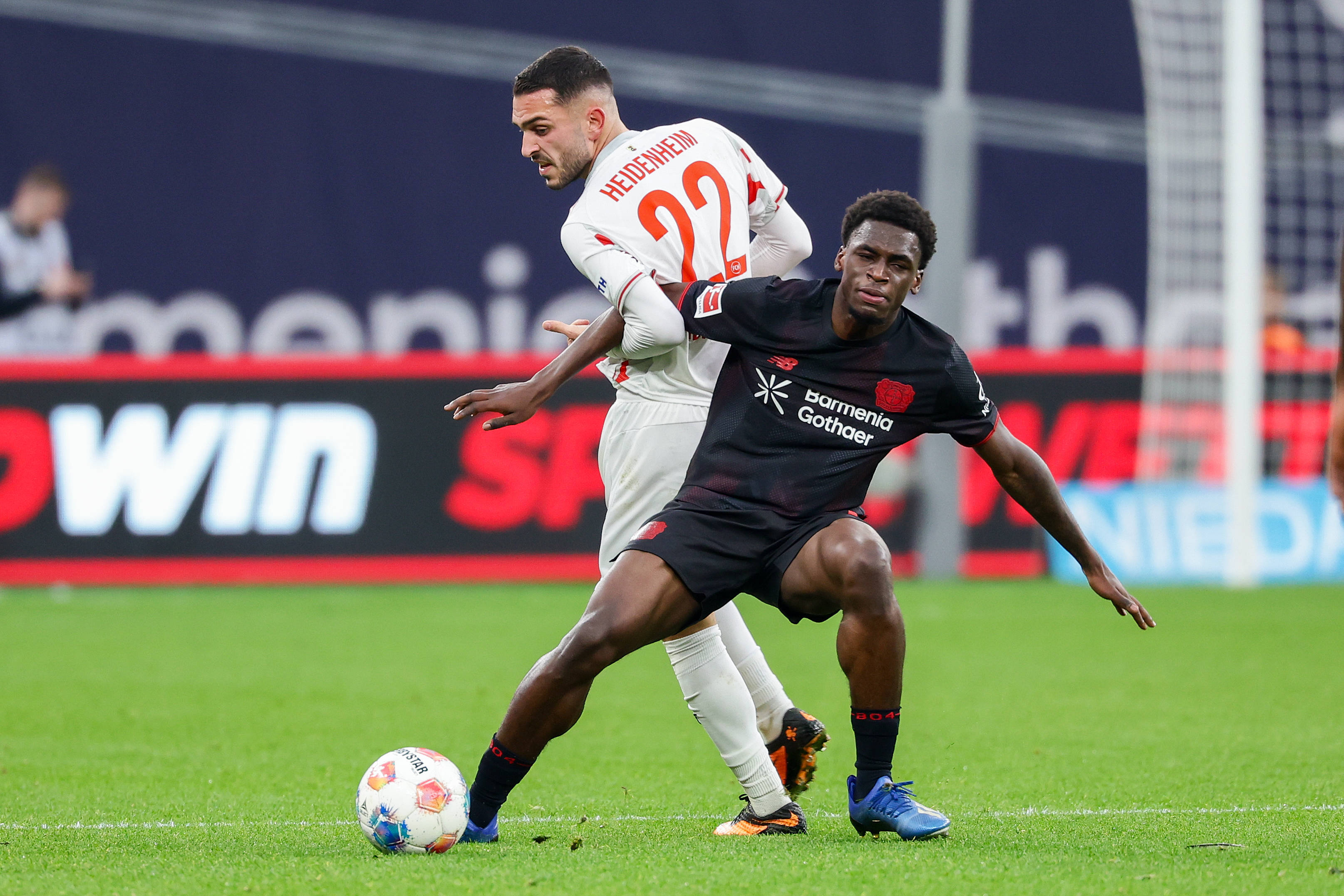 เมื่อวันที่ 8 พฤศจิกายน พุกกี้ของไบเออร์ เลเวอร์คูเซ่น (ซ้าย) และบุชของไฮเดนไฮม์ต่อสู้แย่งบอลระหว่างการแข่งขัน สำนักข่าวซินหัว (ภาพโดย Joachim Bivallés)