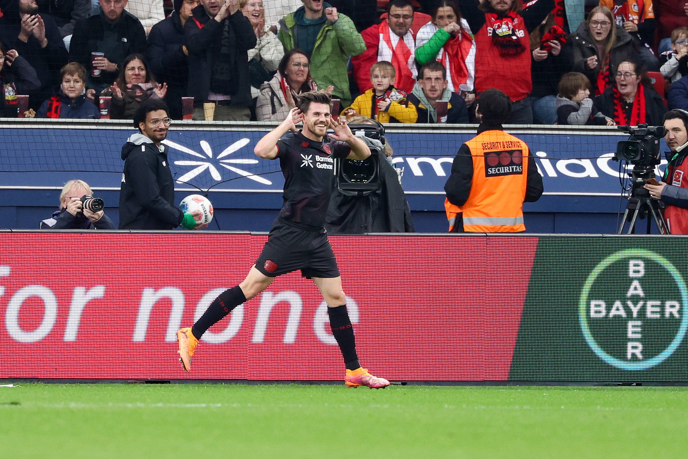 เมื่อวันที่ 8 พฤศจิกายน นักเตะของไบเออร์ เลเวอร์คูเซ่น จูเลียน ฮอฟมันน์ ฉลองการทำประตูได้ สำนักข่าวซินหัว (ภาพถ่ายโดย Joachim Bivallés)