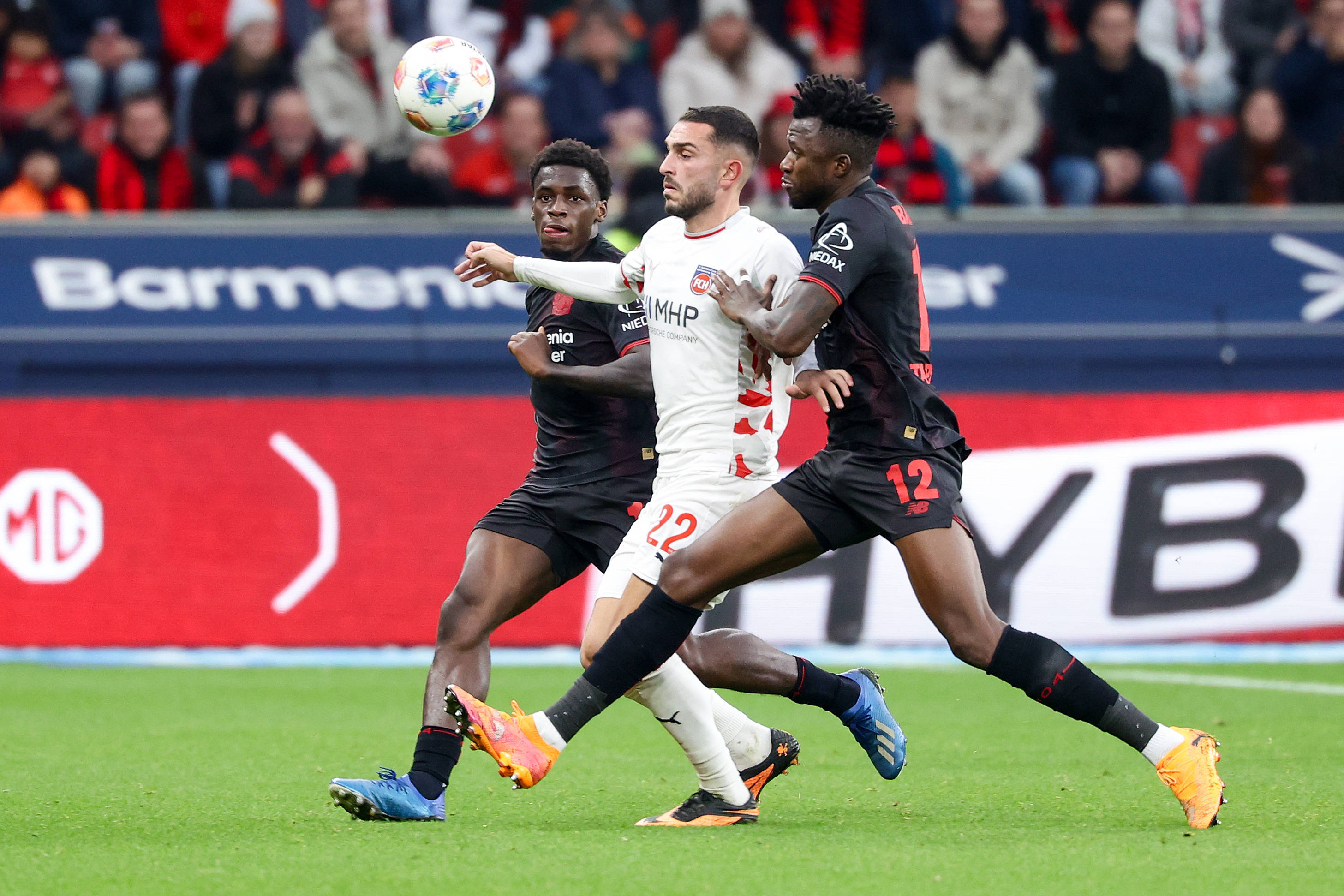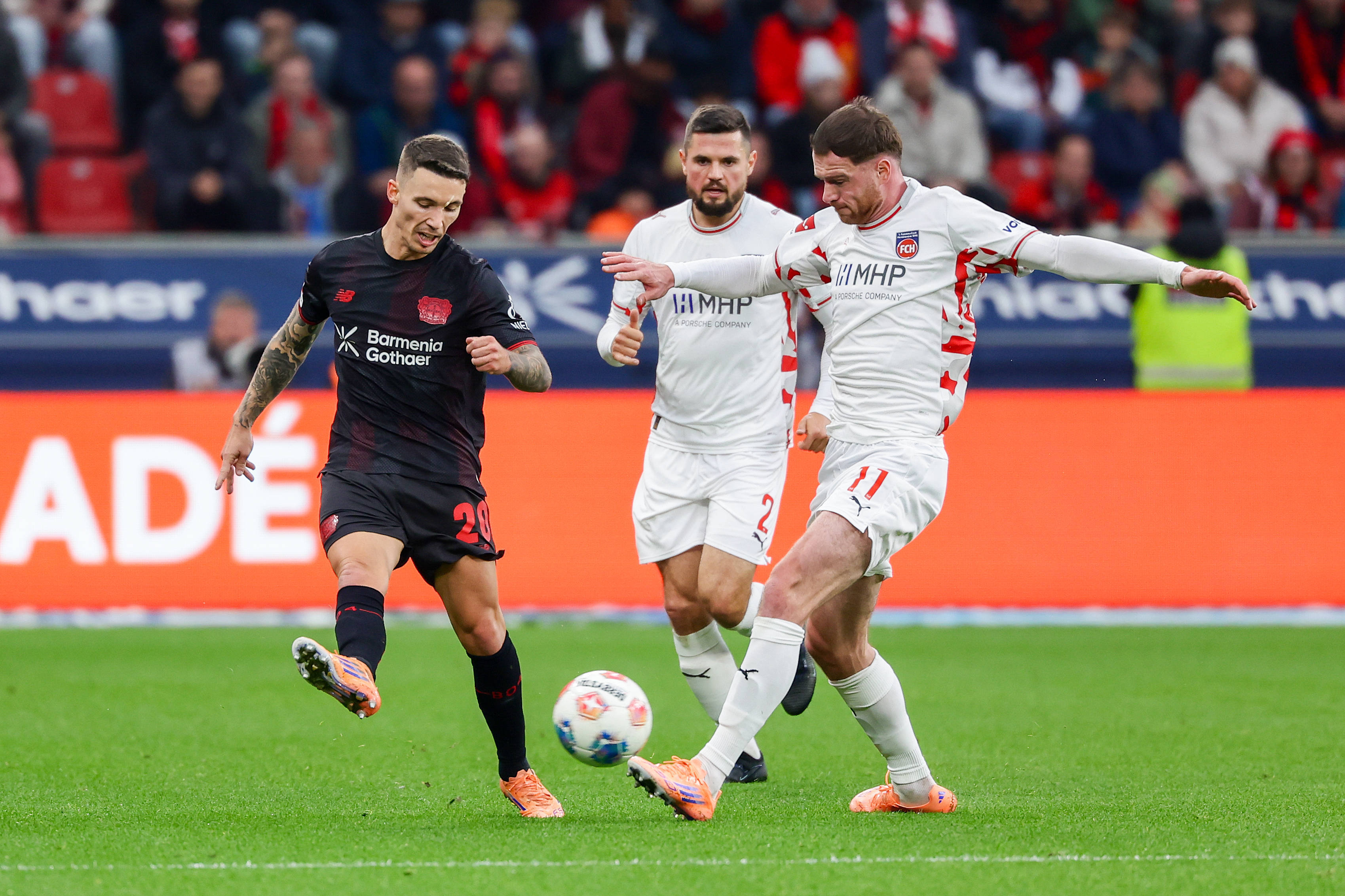 เมื่อวันที่ 8 พฤศจิกายน นักเตะของไบเออร์ เลเวอร์คูเซ่น โทมัส เลนซ์ (ขวา) และอัลบาโร โนเช (ซ้าย) กำลังท้าทายอิบราฮิโมวิชของ 1. เอฟซี ไฮเดนไฮม์ ระหว่างการแข่งขัน สำนักข่าวซินหัว (ภาพถ่ายโดย Joachim Bivalliez)