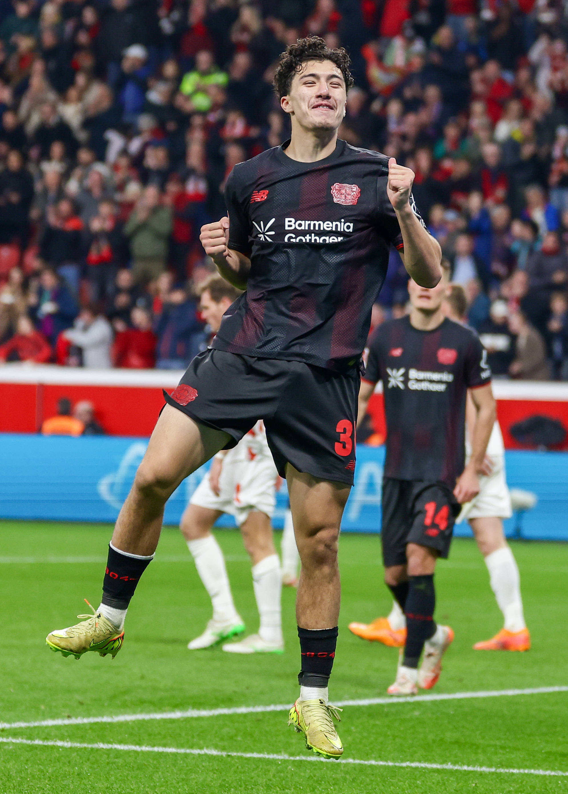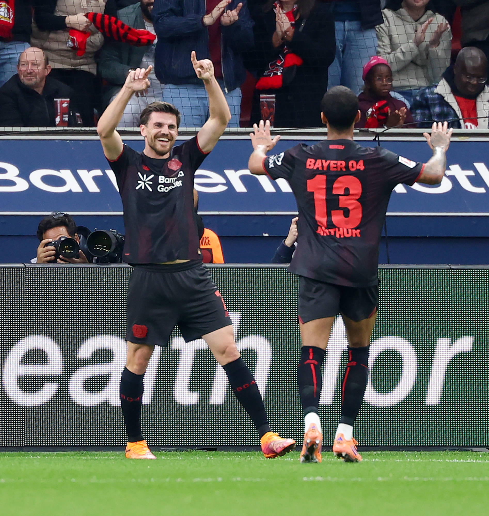 เมื่อวันที่ 8 พฤศจิกายน จูเลียน ฮอฟมันน์ (ซ้าย) ของไบเออร์ เลเวอร์คูเซ่น ฉลองกับเพื่อนร่วมทีม อาร์เธอร์ หลังจากทำประตูได้ สำนักข่าวซินหัว (ภาพโดย Joachim Bivalliez)