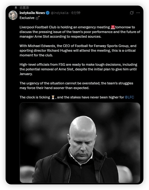 หลังจากความพ่ายแพ้อย่างน่าอับอาย 1-4 ในบ้านในศึกยูฟ่า แชมเปียนส์ลีก ความตึงเครียดภายในสโมสรลิเวอร์พูล เอฟซี ได้เพิ่มขึ้นอย่างมาก สำนักข่าวหลายแห่งที่มีความน่าเชื่อถือได้ยืนยันว่าผู้บริหารระดับสูงของสโมสรจะจัดการประชุมฉุกเฉินภายใน 48 ชั่วโมงข้างหน้าเพื่อหารือเกี่ยวกับอนาคตของผู้จัดการทีม อาร์เน่ สลอตตั้งแต่เดือนตุลาคมที่ผ่านมา ลิเวอร์พูลประสบความพ่ายแพ้ถึงเก้าครั้งในสิบสองนัดการแข่งขันล่าสุด ซึ่งเป็นผลงานที่แย่ที่สุดในรอบสิบปีของพวกเขา และยิ่งตอกย้ำความเชื่อที่ว่าความมั่นใจภายในห้องแต่งตัวกำลังลดลงอย่างรวดเร็ว แม้ว่าสล็อทจะยืนยันว่าทีม "ยังไม่สูญเสียการควบคุมอย่างสิ้นเชิง" แต่การล้มเหลวอย่างต่อเนื่องในผลการแข่งขันทำให้วิกฤตนี้ไม่สามารถมองข้ามได้สำหรับคณะกรรมการบริหาร