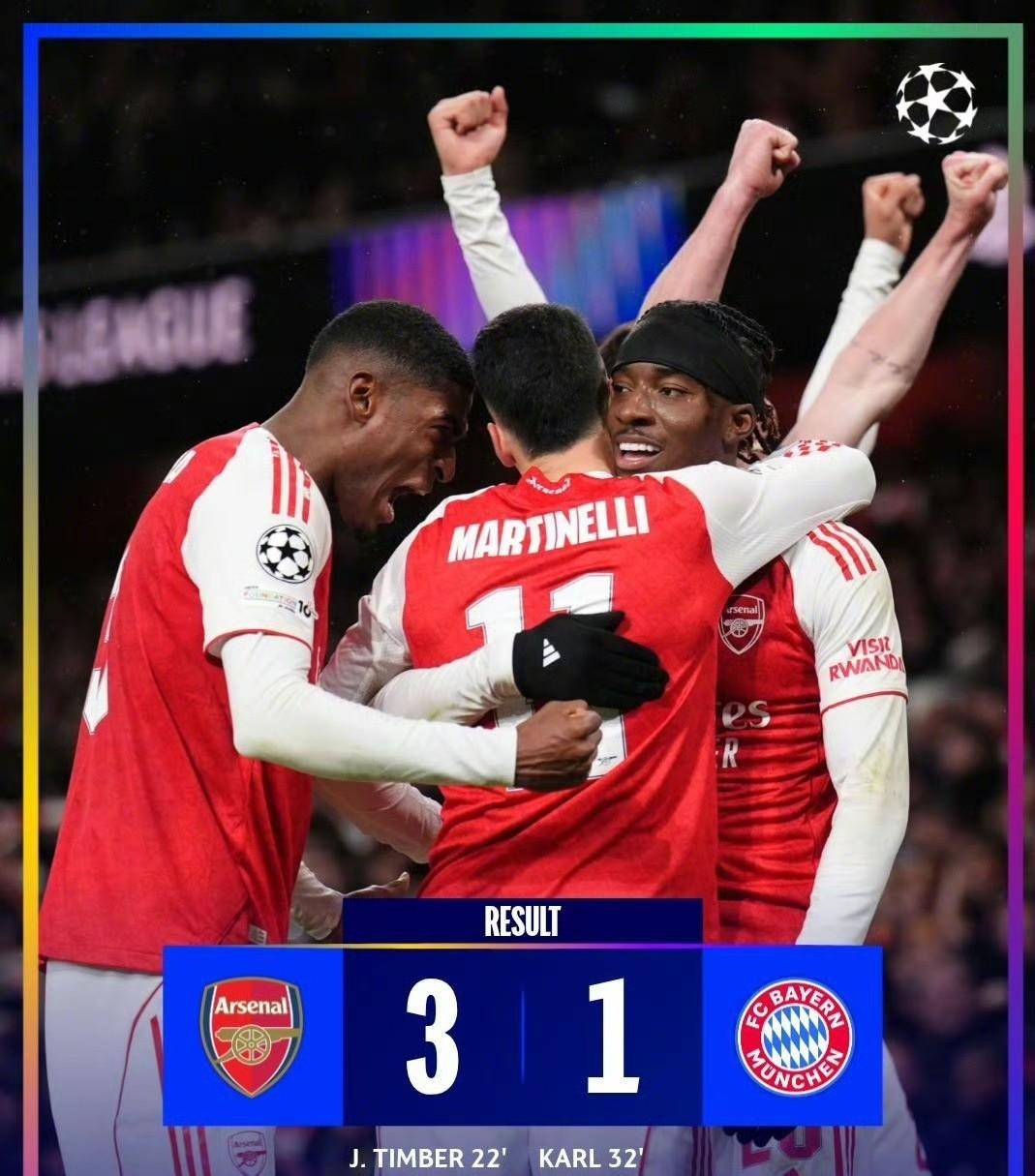 ขณะเดียวกัน อาร์เซนอลสามารถเอาชนะบาเยิร์น มิวนิกได้ 3-1 ในบ้าน ทำให้พวกเขากลายเป็นทีมเดียวในฤดูกาลนี้ของแชมเปียนส์ลีกที่รักษาสถิติไม่แพ้ใครไว้ได้