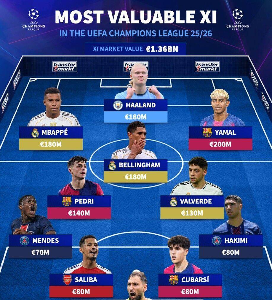 แชมเปียนส์ลีกกลับมาอีกครั้งพร้อมดาวดังที่เปล่งประกาย และ Transfermarkt ได้เปิดเผย 'ทีมทองคำ' ที่มีมูลค่าสูงที่สุด – ทีม 11 คนที่มีมูลค่าสูงที่สุดสำหรับฤดูกาลใหม่ ทุกตารางนิ้วของสนามหญ้าในรายชื่อนี้เต็มไปด้วยกลิ่นของเงินยูโร มาดูกันเถอะ!