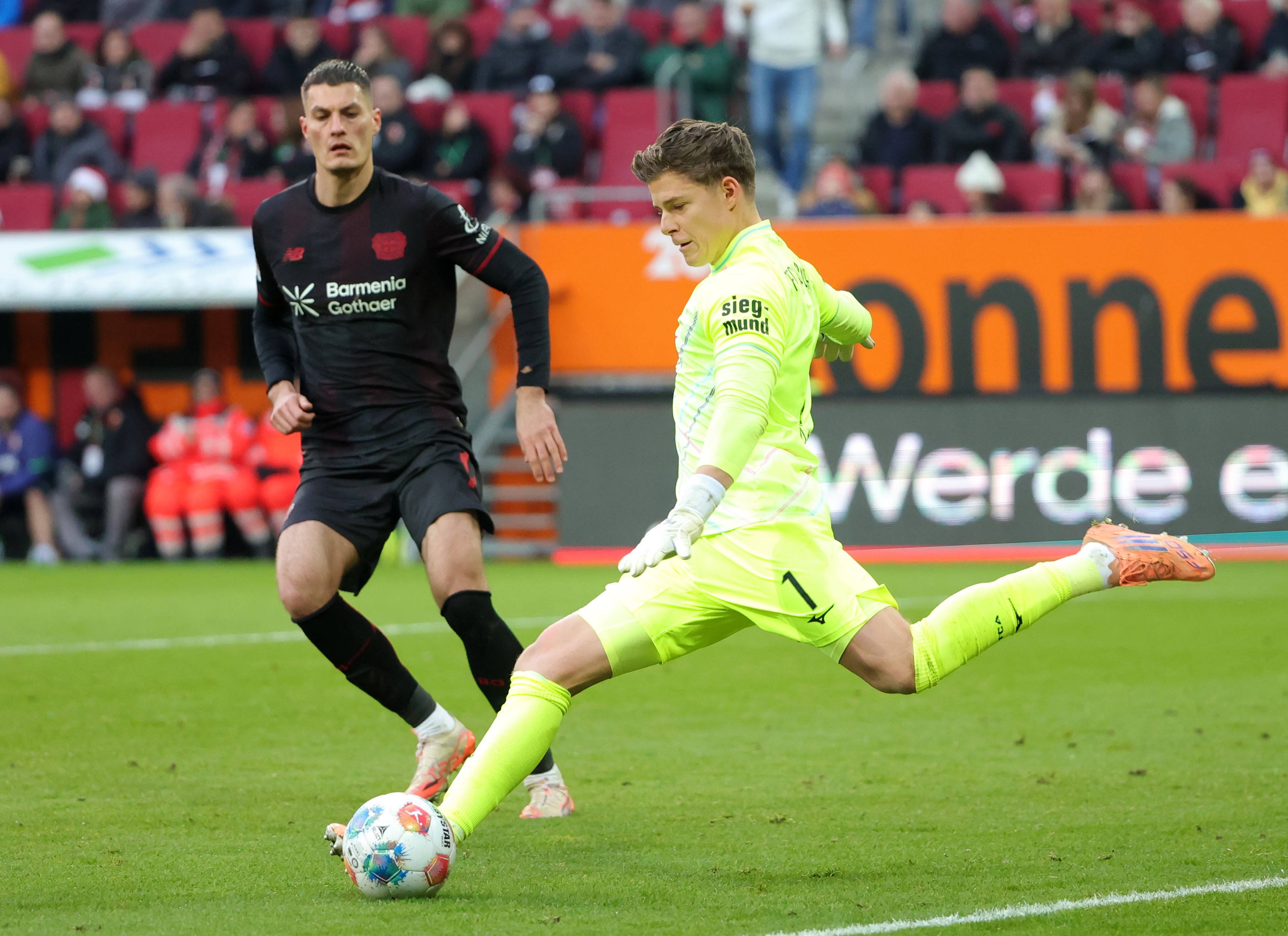 เมื่อวันที่ 6 กุมภาพันธ์ คาเดร (ซ้าย) ของเอาก์สบวร์ก และแทปโซบา ของไบเออร์ เลเวอร์คูเซ่น แย่งโหม่งลูกบอลระหว่างการแข่งขัน สำนักข่าวซินหัว (ภาพโดย ฟิลิปป์ รุยซ์)