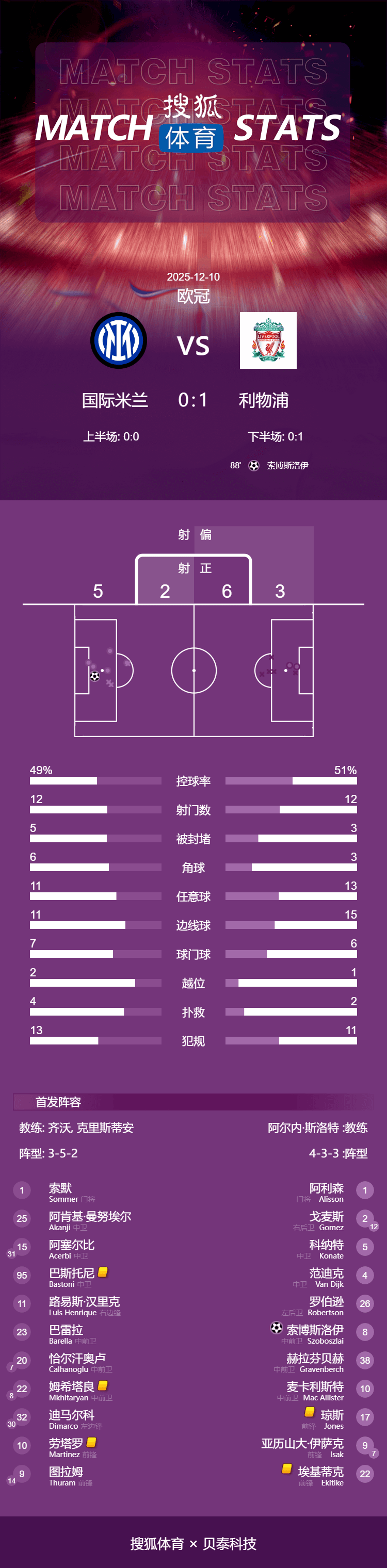 เวลา 04:00 น. ตามเวลาปักกิ่ง วันที่ 10 ธันวาคม การแข่งขันยูฟ่าแชมเปียนส์ลีก ฤดูกาล 2025-26 รอบที่ 6 ได้เริ่มต้นขึ้น ลิเวอร์พูลสามารถเอาชนะอินเตอร์ มิลานได้ 1-0 ที่สนามซานซิโร ประเทศอิตาลี ทำให้อินเตอร์ มิลานแพ้ในยูฟ่าแชมเปียนส์ลีกเป็นนัดที่สองติดต่อกัน และเป็นการแพ้ในบ้านในรายการนี้เป็นครั้งแรกในรอบ 18 นัดของเจ้าบ้านประตูเดียวของเกมเกิดขึ้นในนาทีที่ 88 โดย ซโบซไล ยิงจุดโทษที่ วิร์ตซ์ ได้มา ทำให้ทีมคว้าชัยชนะไปได้ นอกจากนี้ โกนาเต้ ยังมีประตูที่ถูกยกเลิกเนื่องจากแฮนด์บอลของเพื่อนร่วมทีม เอคิติ