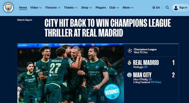ในช่วงเช้าตรู่ของวันที่ 11 ธันวาคม ตามเวลาปักกิ่ง การแข่งขันระหว่างทีมจ่าฝูงในรอบที่หกของรอบแรก (รอบแบ่งกลุ่ม) ของยูฟ่าแชมเปียนส์ลีกฤดูกาลนี้ได้เกิดขึ้นที่สนามซานติอาโก เบร์นาเบว ในกรุงมาดริด ทีมแมนเชสเตอร์ ซิตี้ จากพรีเมียร์ลีก คว้าชัยชนะ 2-1 จากทีมยักษ์ใหญ่ลาลีกา เรอัล มาดริด ด้วยประตูจากโอ'ไรลีย์และฮาแลนด์