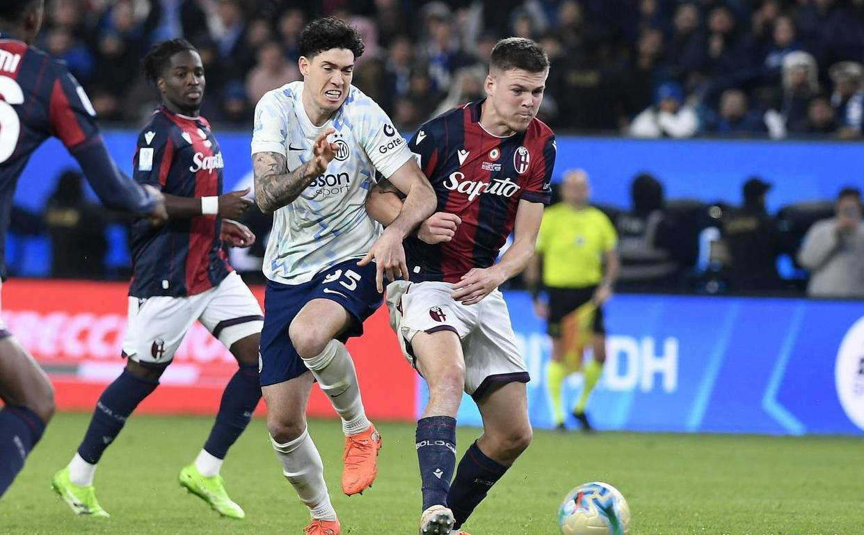 ตั้งแต่เริ่มต้น อินเตอร์ มิลาน แสดงเจตนาอย่างชัดเจน โดย บาสโตนี เปิดเกมรุกทางฝั่งซ้ายและส่งบอลข้ามไป มาร์คัส Thuram เข้าชาร์จด้วยลูกวอลเลย์ที่ยอดเยี่ยมที่เสาไกล ทำให้ทีมขึ้นนำ 1-0 ตั้งแต่ต้นเกมในนาทีที่ 14 บาสโตนีมีโอกาสยิงประตูจากในกรอบเขตโทษ แต่ลูกยิงของเขาพุ่งข้ามคานออกไปเล็กน้อย ในนาทีที่ 24 ซีลินสกี้พยายามสร้างโอกาสหลายครั้ง โดยลูกครอสของเขาเข้าไปในกรอบเขตโทษหลังจากที่ดิ มาร์โกส่งบอลจากเส้นหลัง แต่ถูกราวาเกลียเคลียร์ออกไปได้การตัดสินใจที่สำคัญเกิดขึ้นในนาทีที่ 30 เมื่อบิสเซ็คใช้มือเล่นบอลในเขตโทษ หลังจากตรวจสอบ VAR ผู้ตัดสินได้ตัดสินให้จุดโทษอย่างเด็ดขาด ออร์โซลินียิงเข้าไปอย่างเยือกเย็น ทำให้โบโลญญ่ากลับมาเสมอกัน ครึ่งแรกจบลงด้วยสกอร์เสมอกันที่หนึ่งประตูต่อหนึ่ง