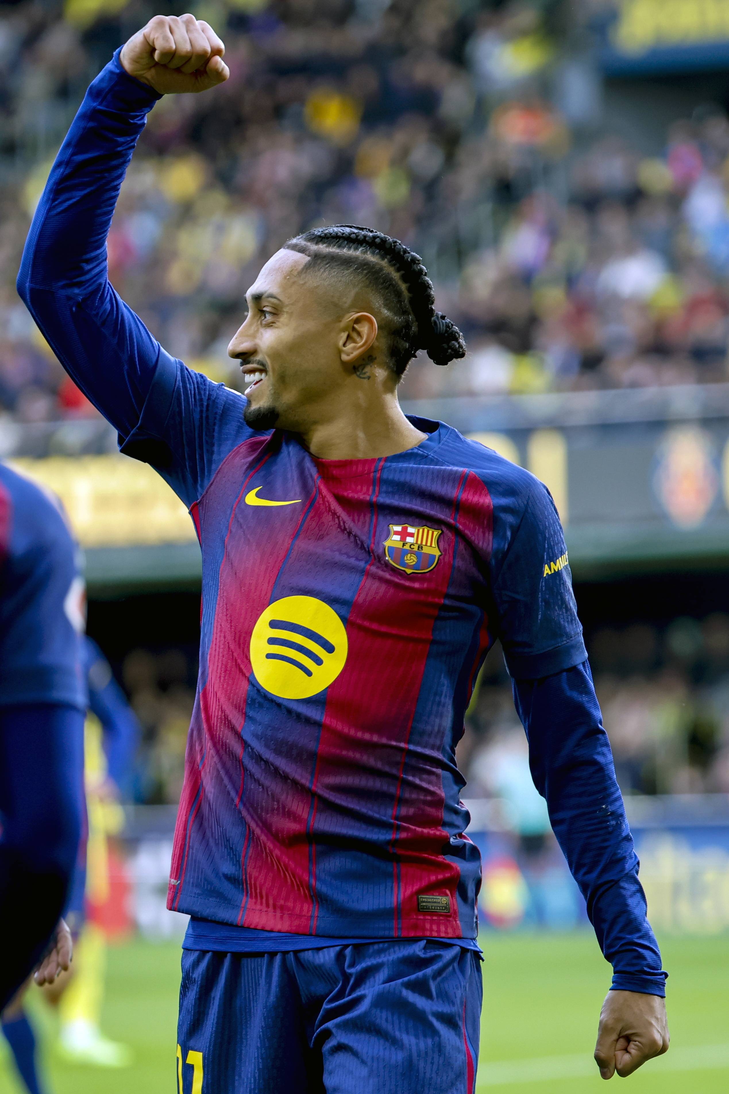 เมื่อวันที่ 21 ธันวาคม ราฟินญ่า นักเตะบาร์เซโลนา (ขวา) ฉลองกับเพื่อนร่วมทีม ยามาล หลังจากทำประตูเปิดให้กับทีม ซินหัว/EPA