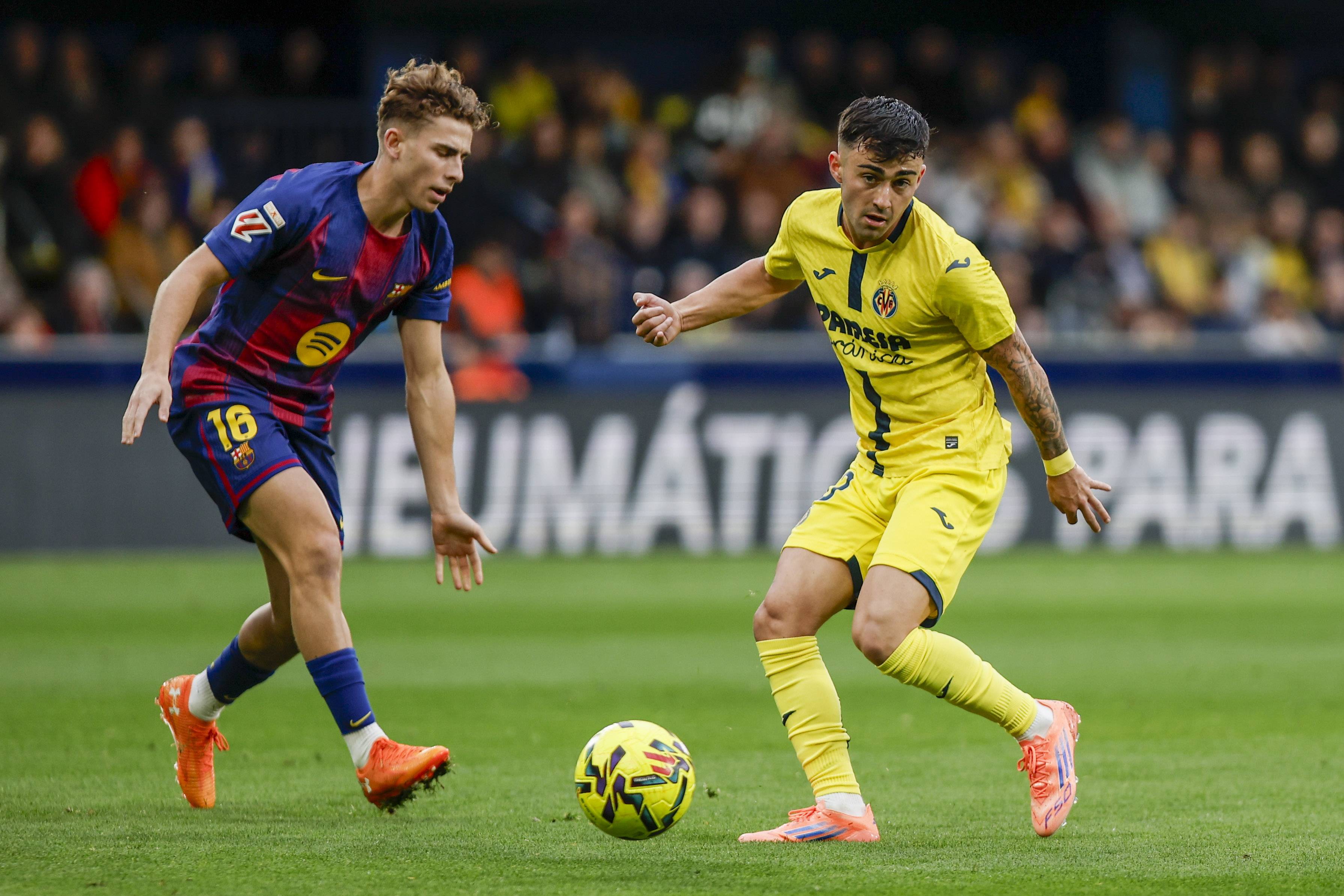 เมื่อวันที่ 21 ธันวาคม โลเปซ (ซ้าย) ของบาร์เซโลนาท้าทายโมเรโร่ของบียาร์เรอัลเพื่อแย่งบอล. ชินหัว/อีพีเอ